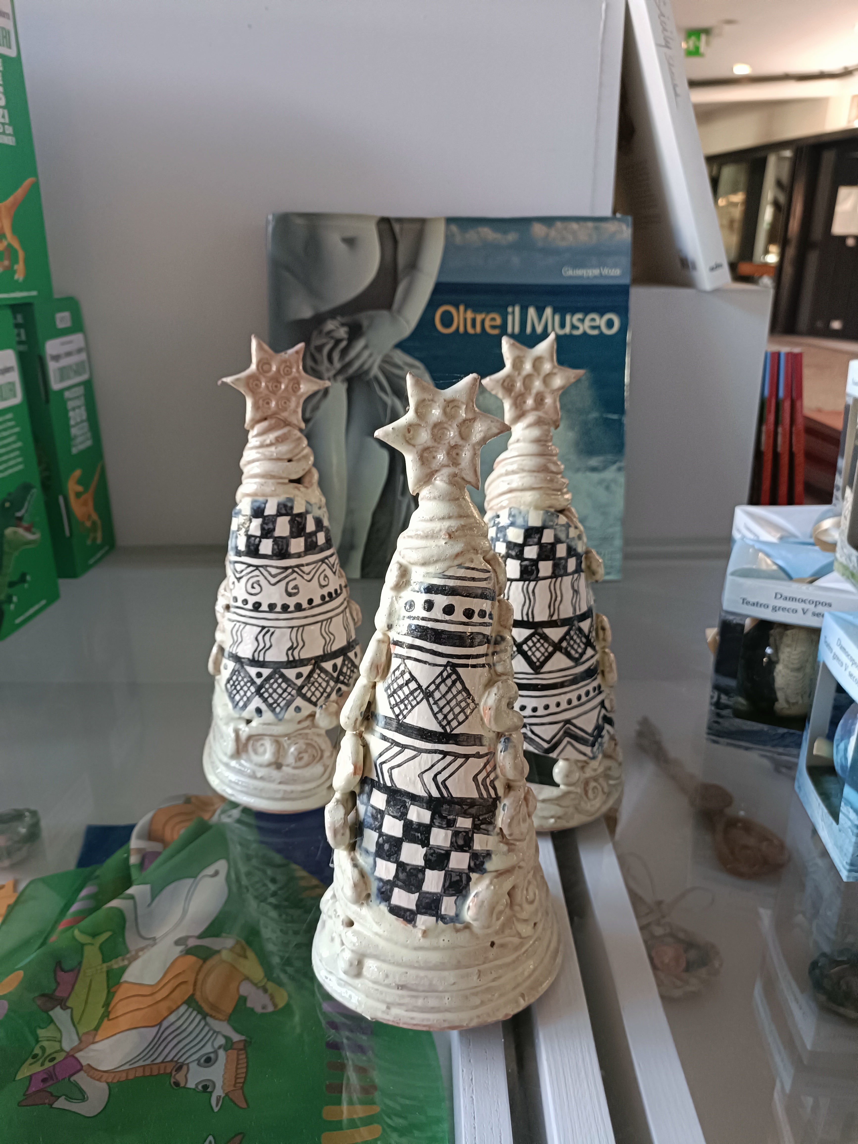 Piccolo albero di Natale da utilizzare come soprammobile, realizzato a mano in ceramica con decoro ispirato alla tradizione siciliana.