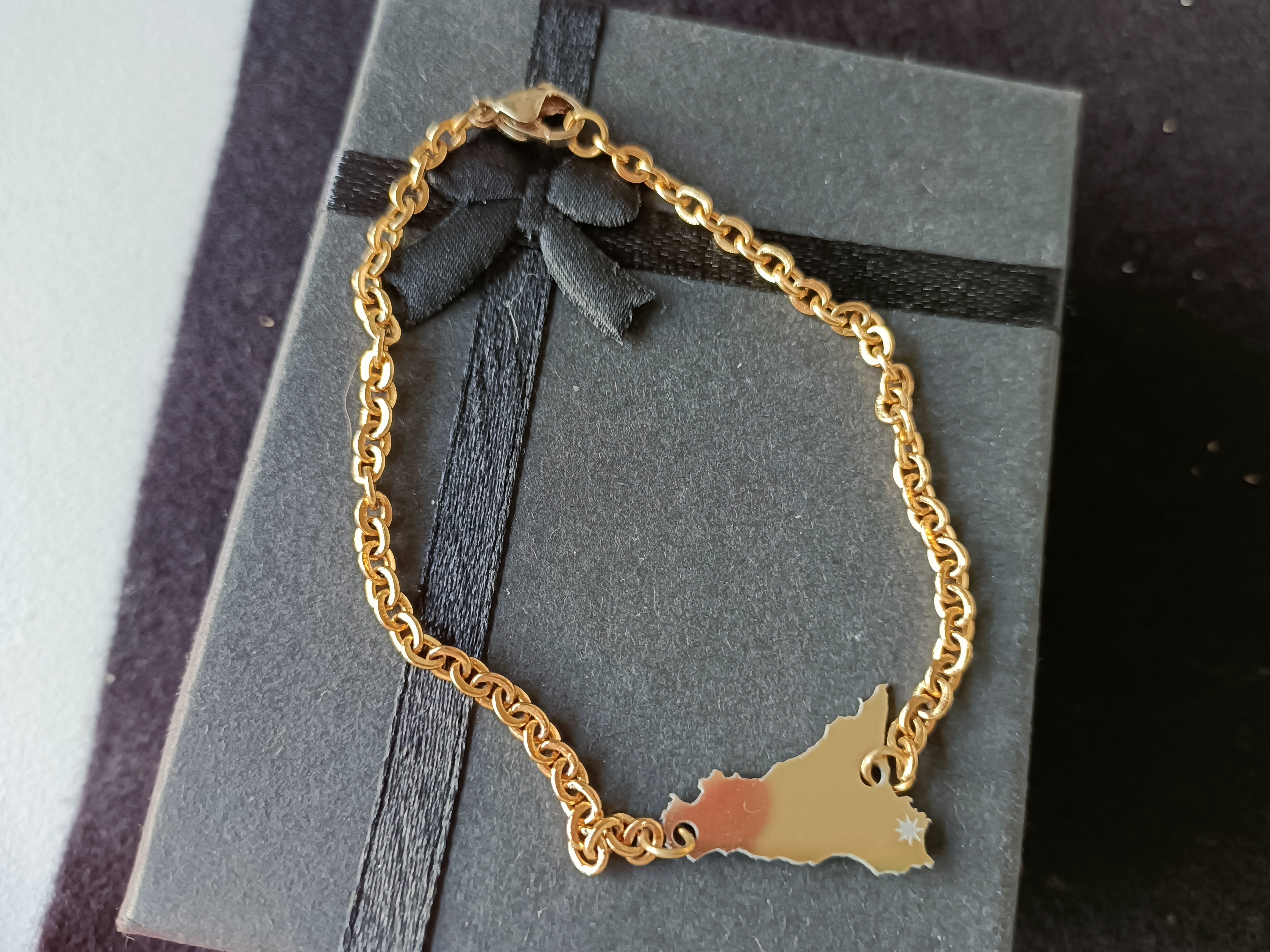 Bracciale color oro con catenella in acciaio e ciondolo a forma di Sicilia intagliato su placca d’acciaio della designer palermitana Desideria Burgio.