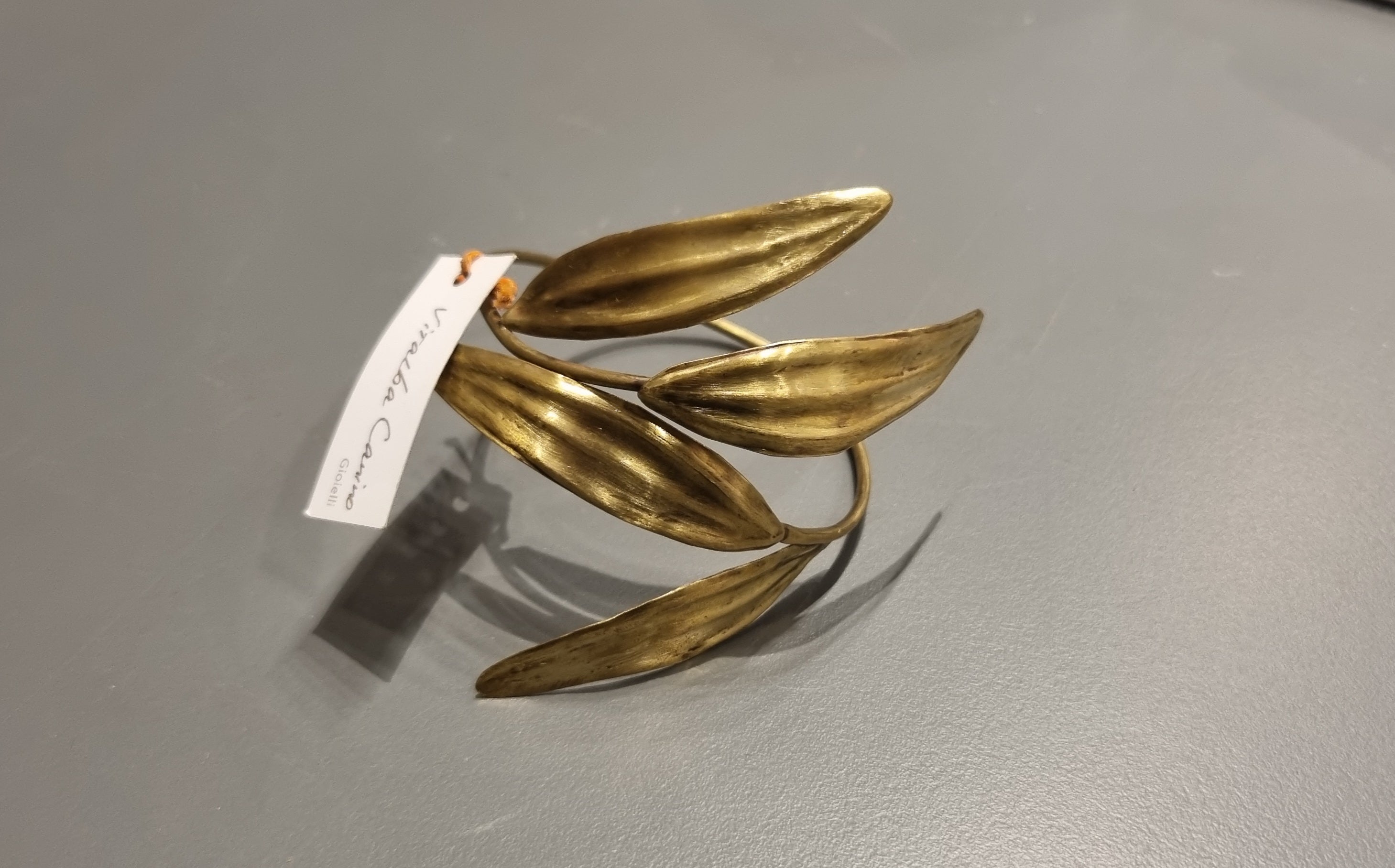 Bracciale a fascia in ottone con foglia di ulivo. Gioiello realizzato a mano dall'artista palermitana Vitalba Canino.