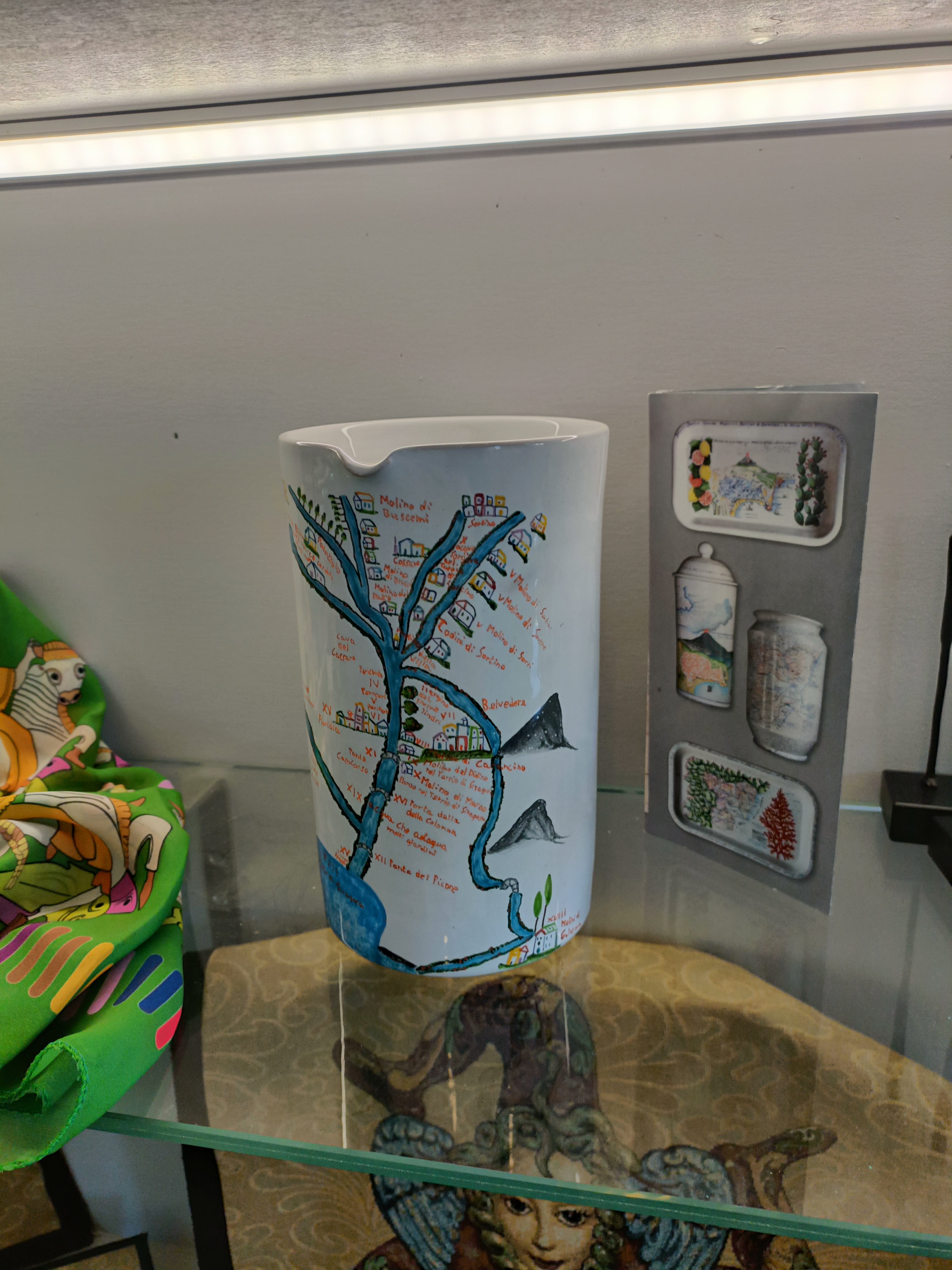 DESCRIZIONE: brocca in ceramica con decoro dipinto a mano raffigurante la cartina geografica della zona in cui si trovano i Mulini di Galerme