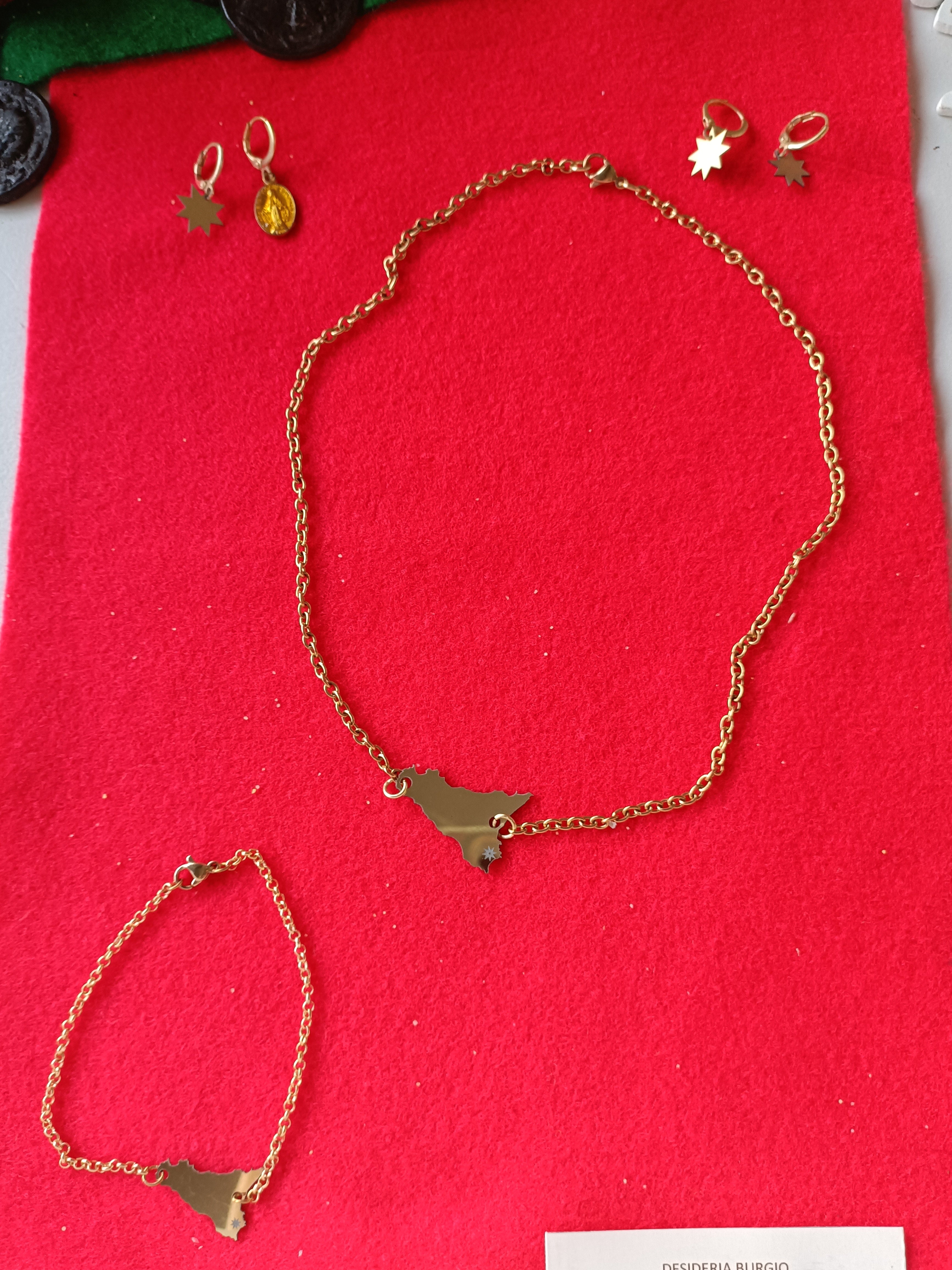Collana color oro con catenella in acciaio e ciondolo a forma di Sicilia intagliato su placca d’acciaio della designer palermitana Desideria Burgio.