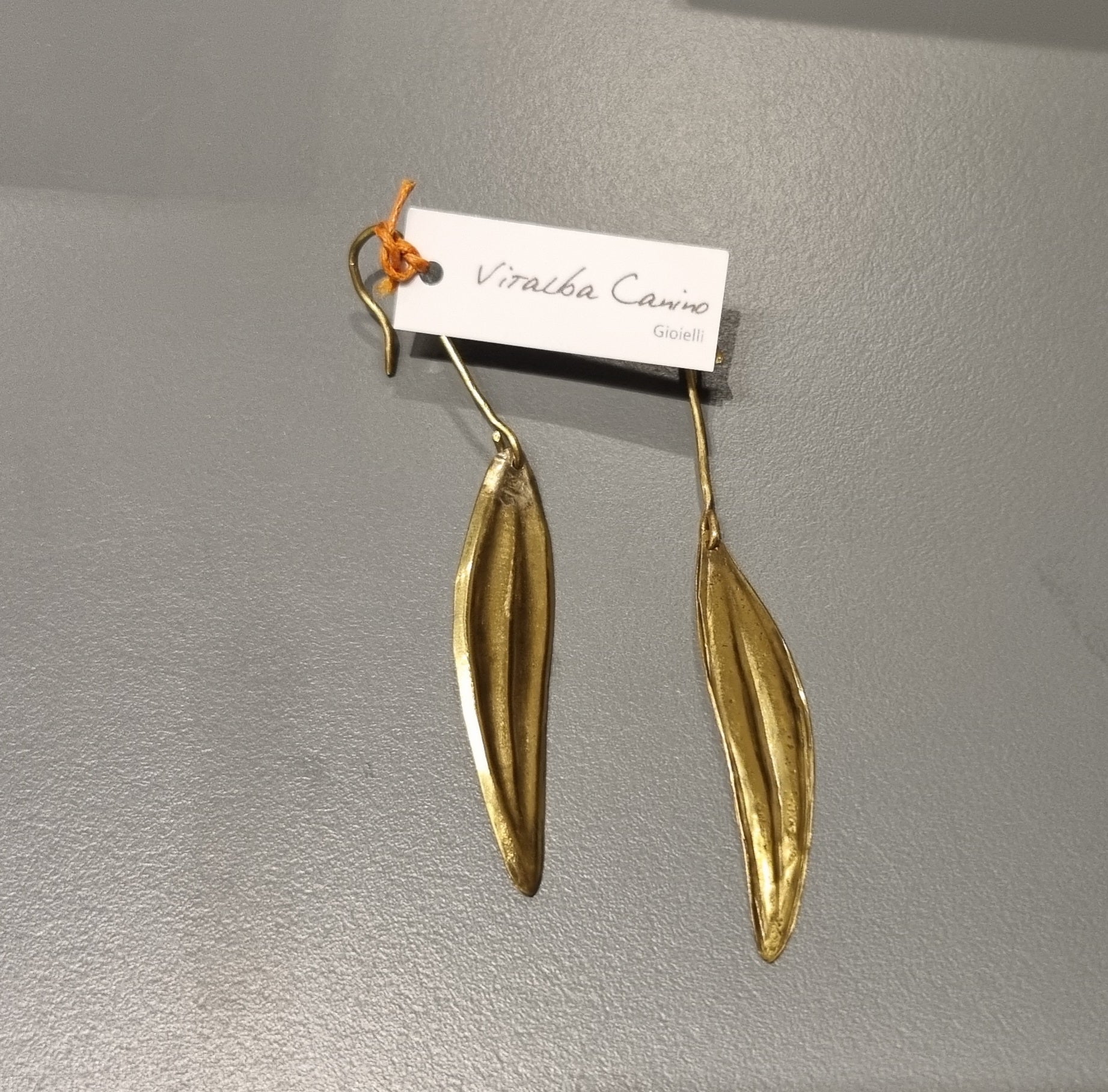 Orecchini pendenti in ottone con foglia di ulivo. Gioiello realizzato a mano dall'artista palermitana Vitalba Canino.