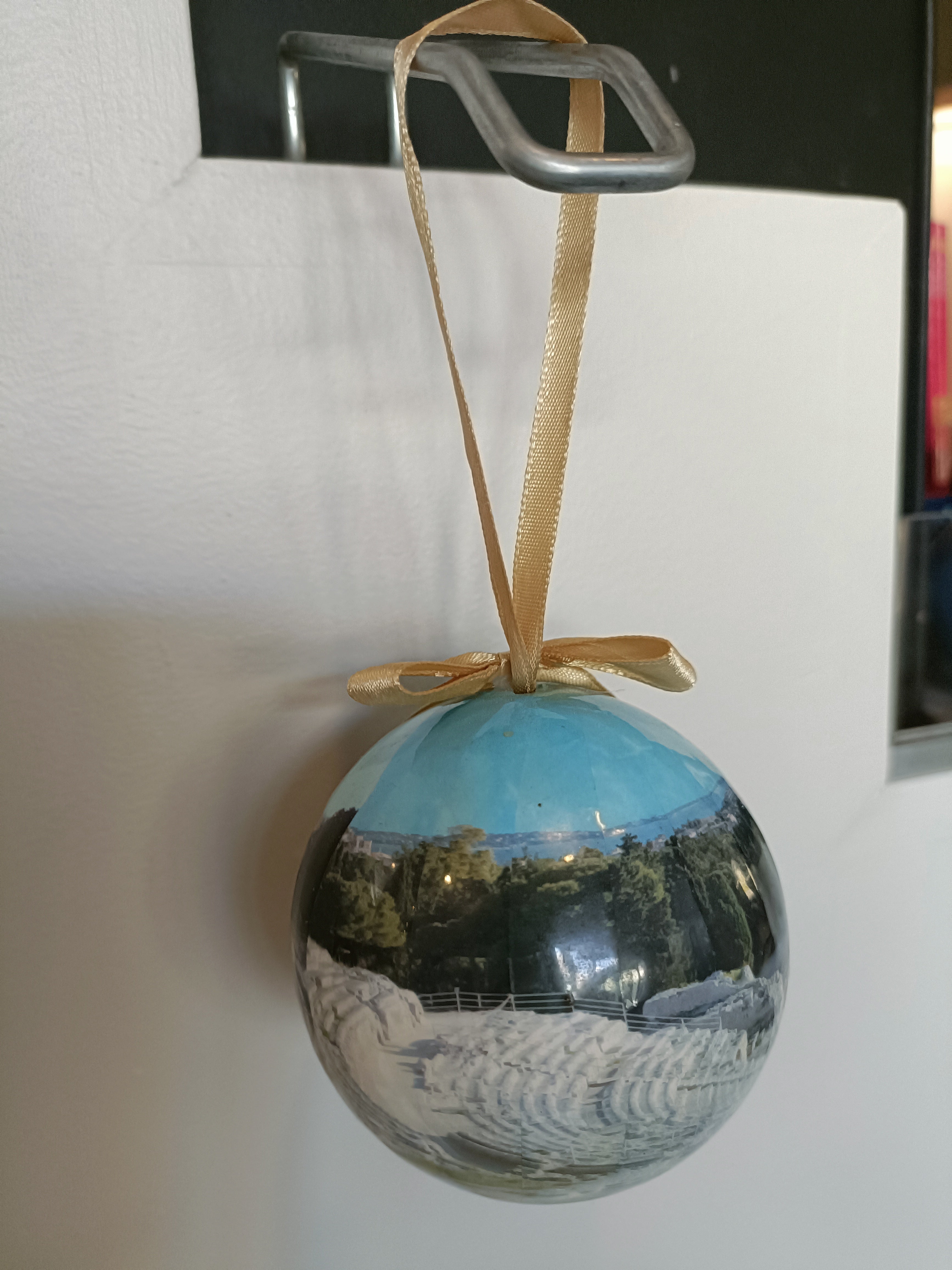 DESCRIZIONE: palla di Natale da appendere all'albero che racchiude al suo interno una miniatura del Teatro Greco di Siracusa